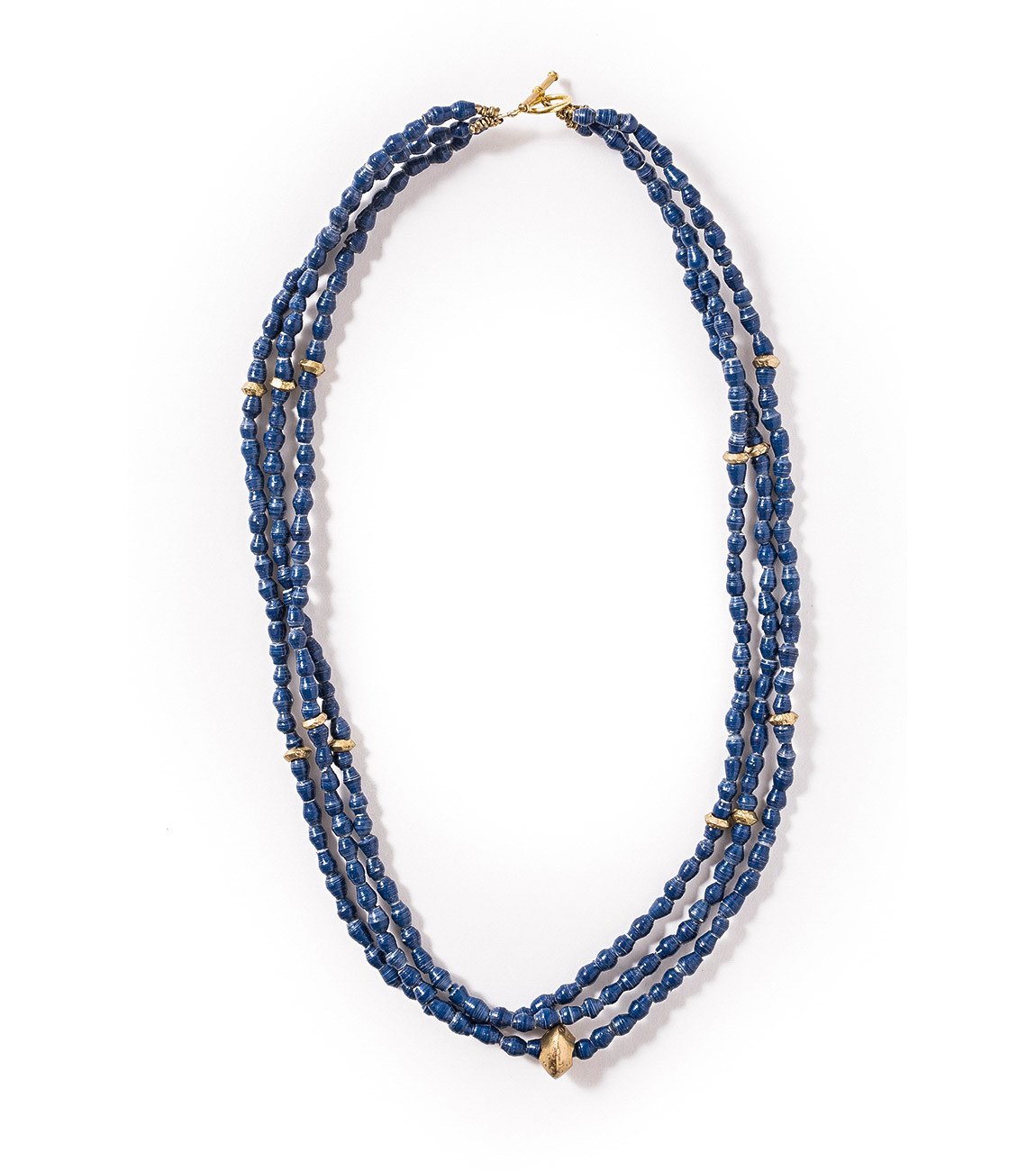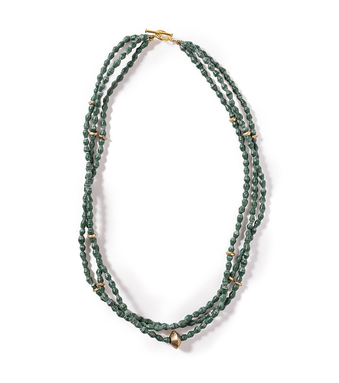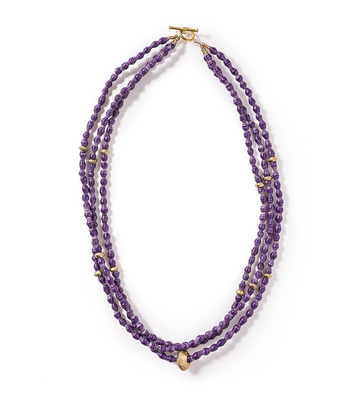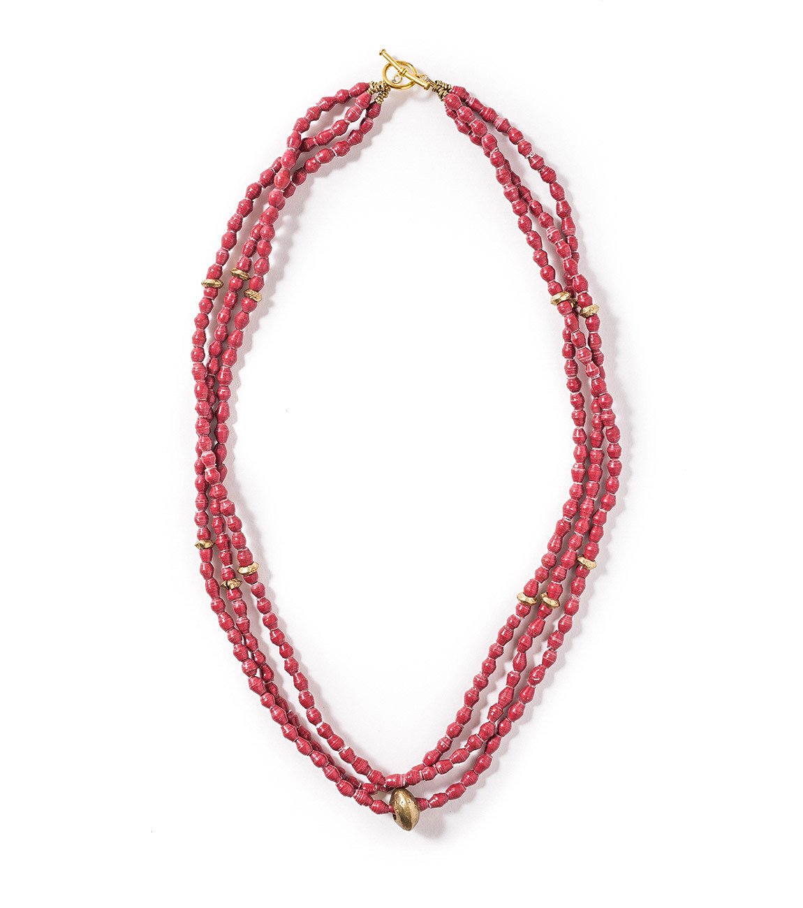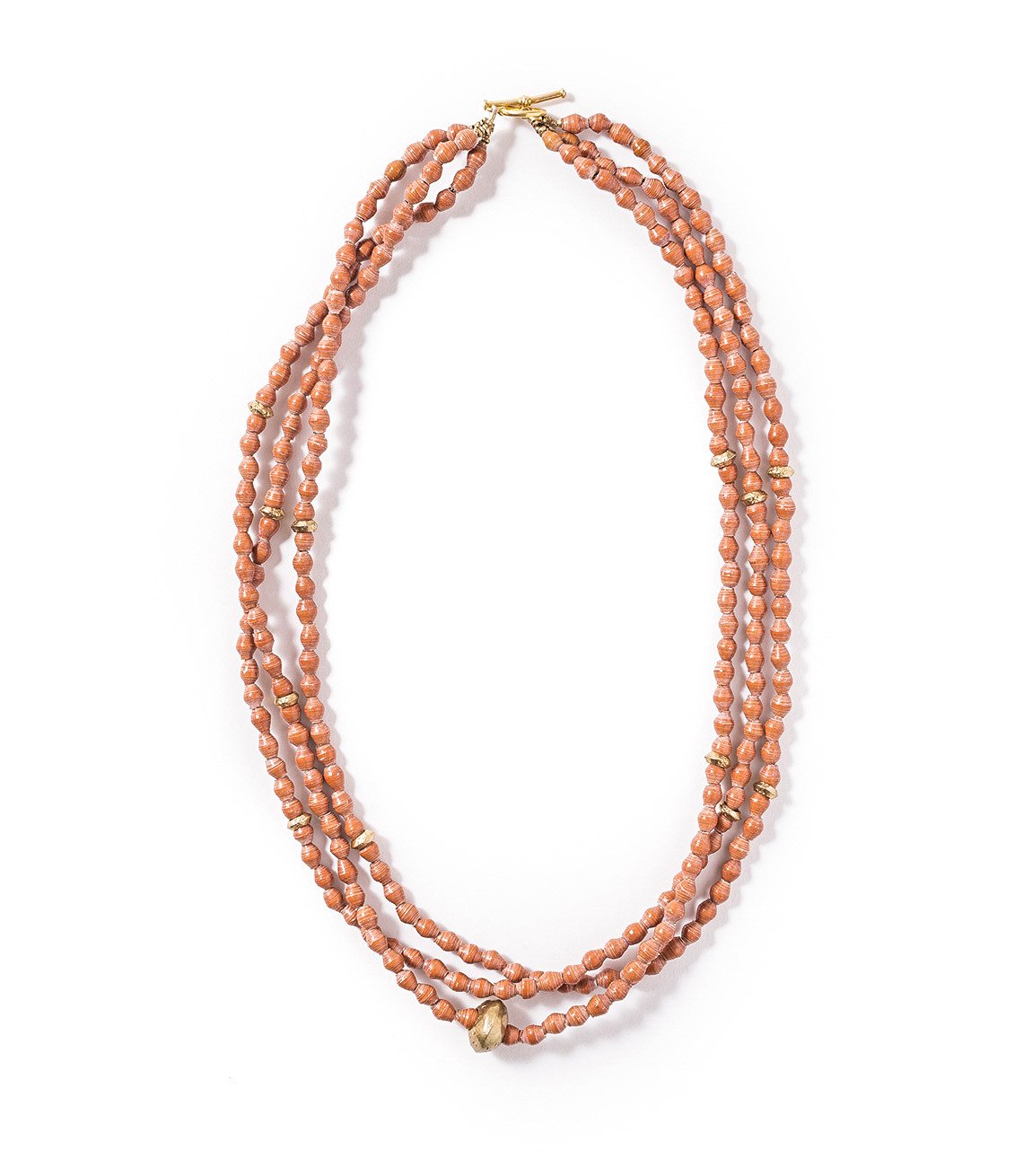 Three strands of hand-rolled paper beads finished in a non-toxic varnish to give a stone like resemblance.
