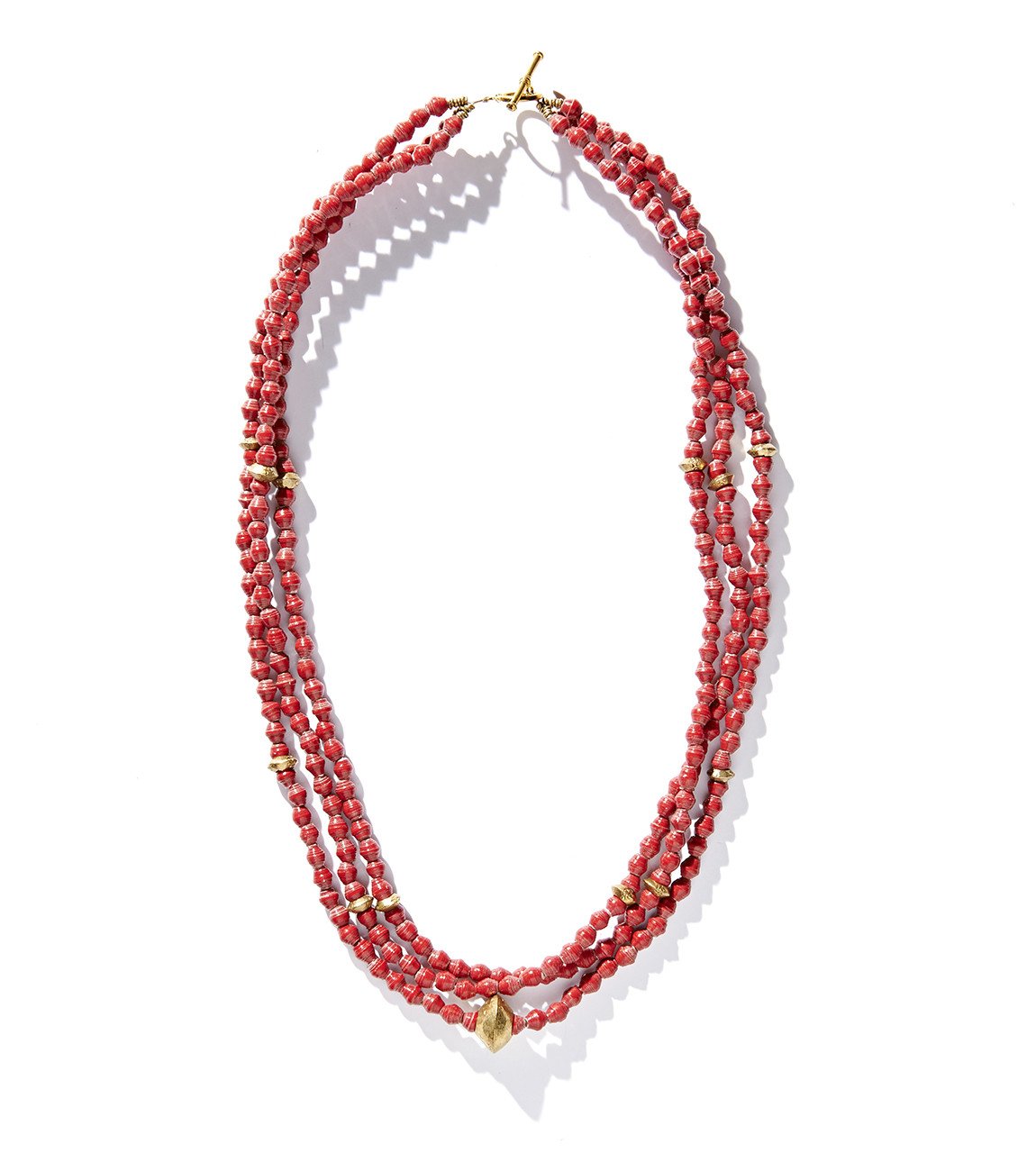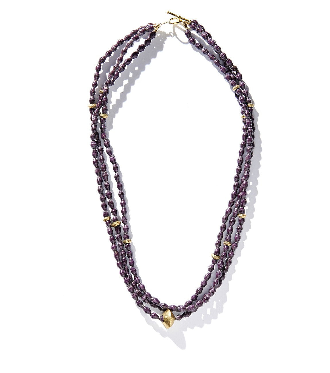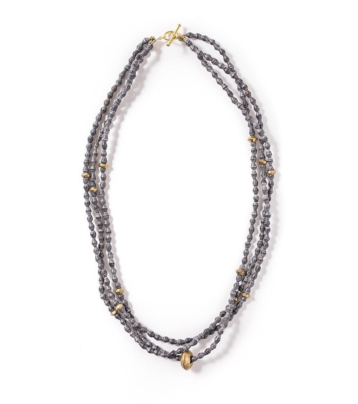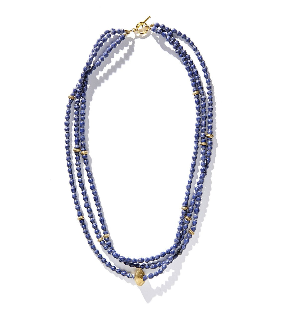 Three strands of hand-rolled paper beads finished in a non-toxic varnish to give a stone like resemblance.