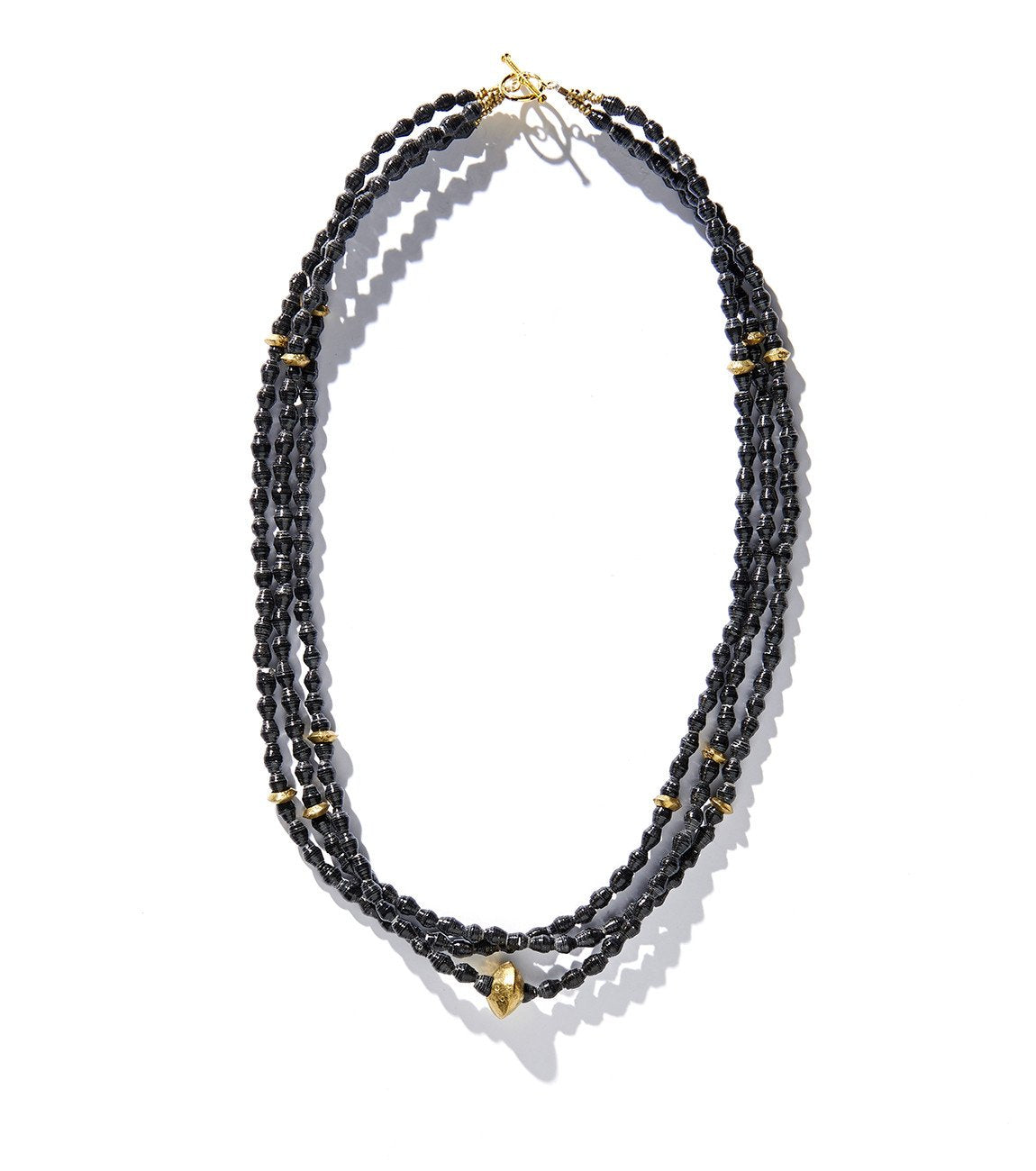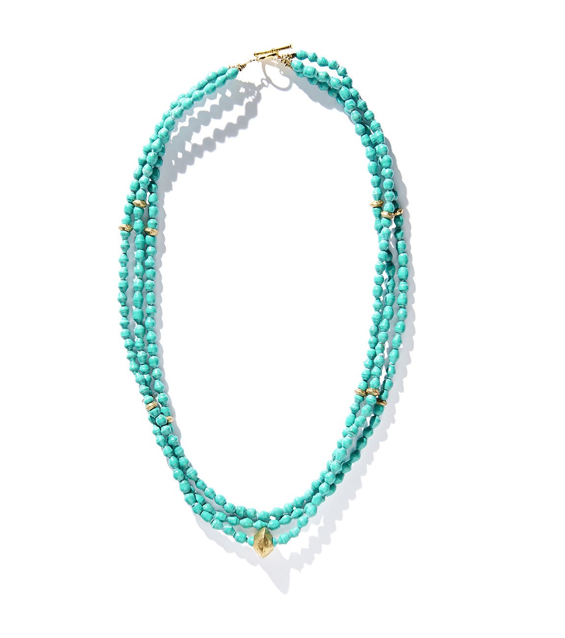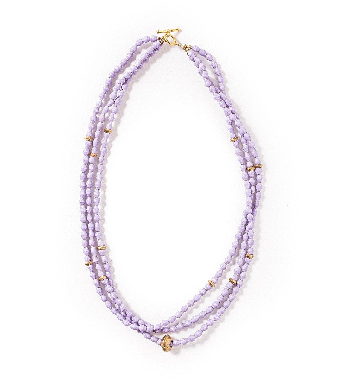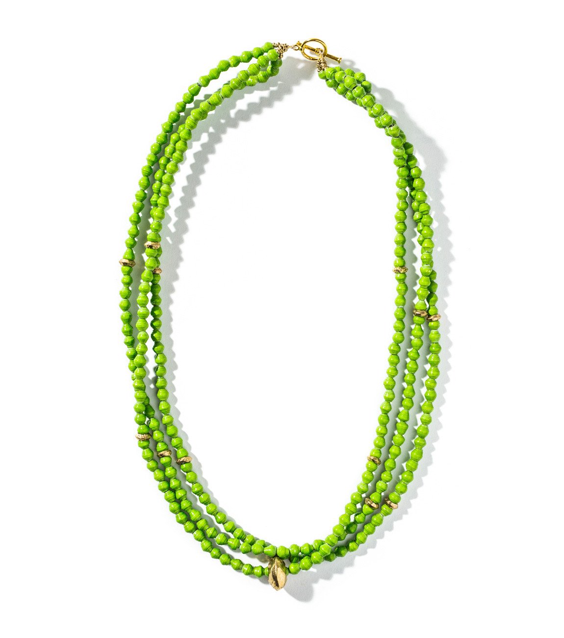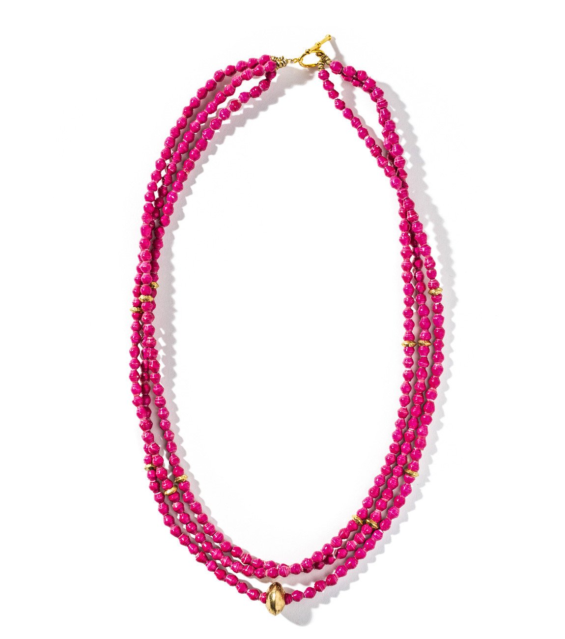 Three strands of hand-rolled paper beads finished in a non-toxic varnish to give a stone like resemblance.