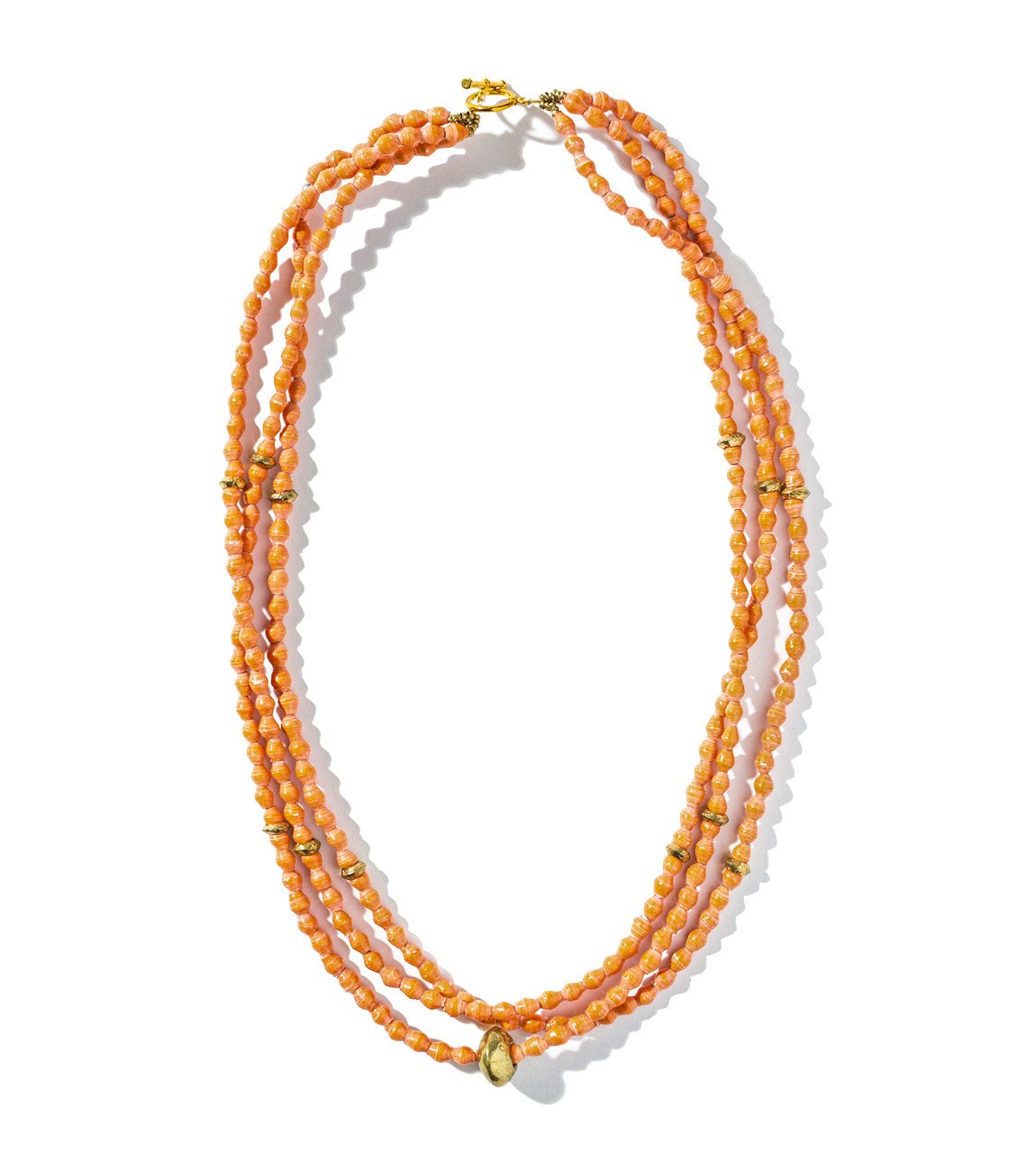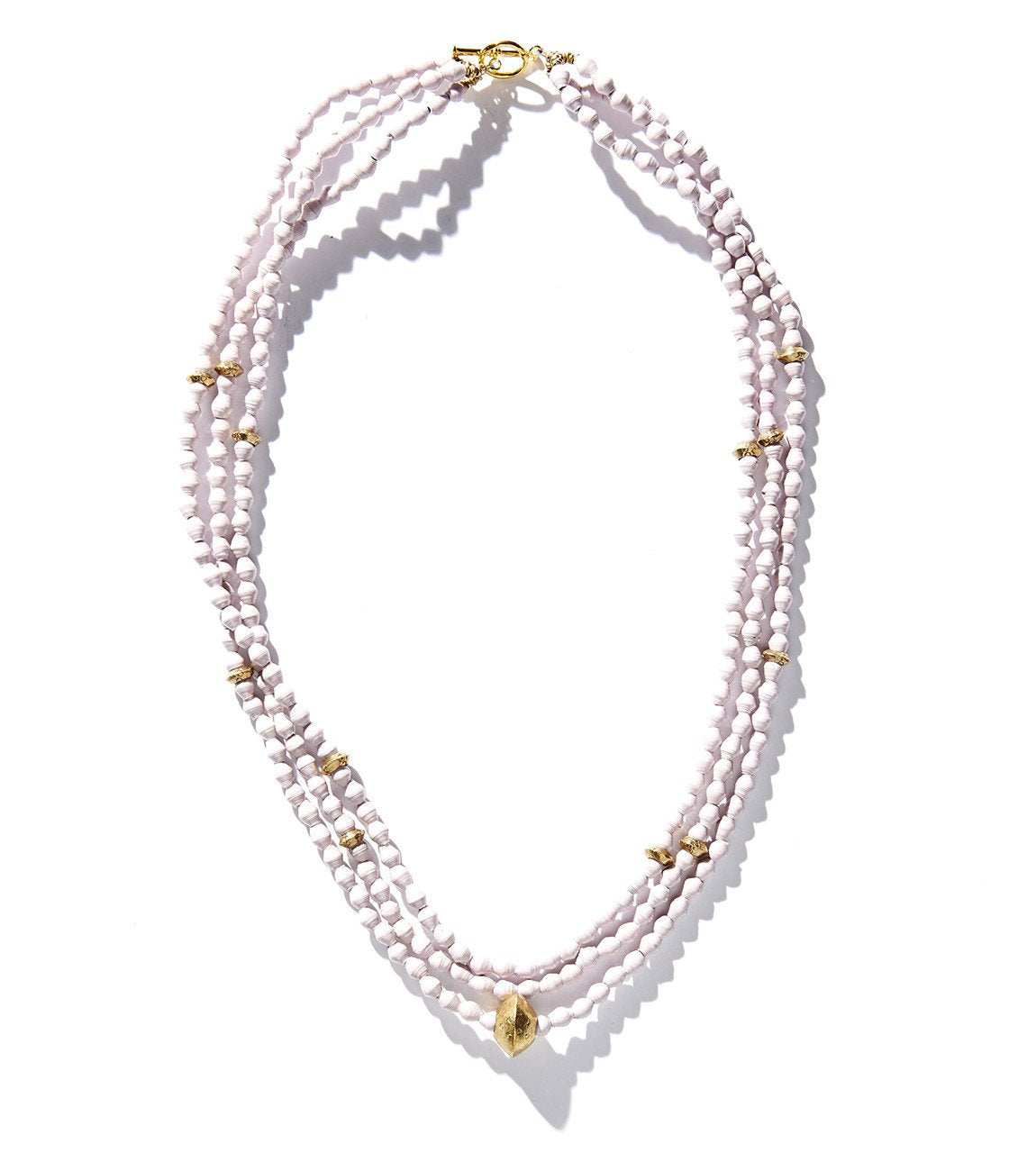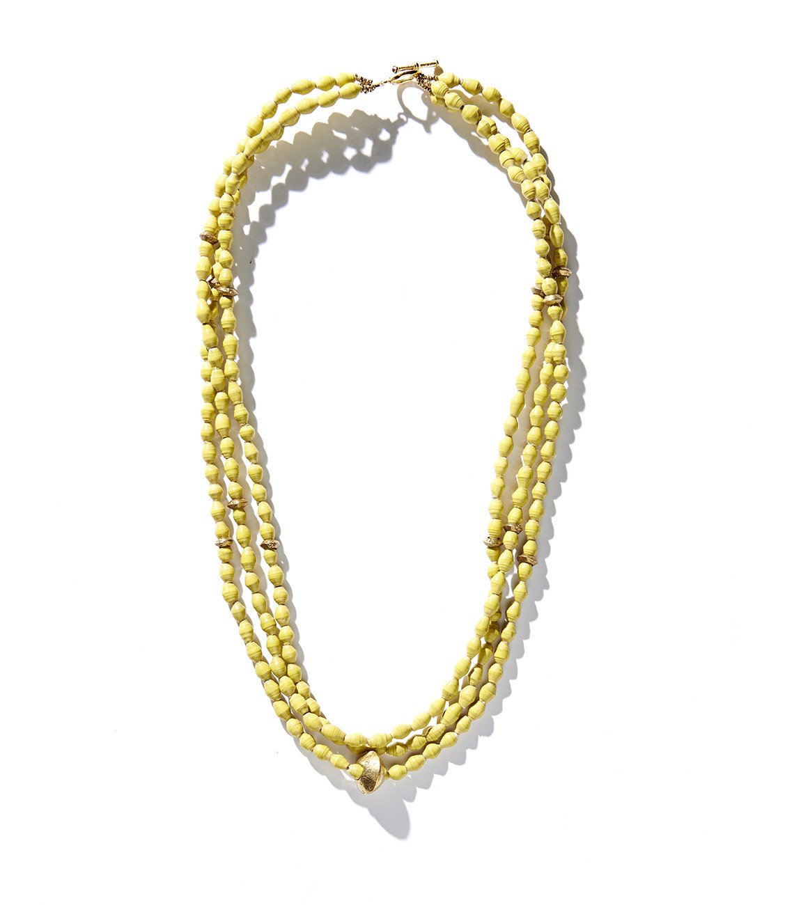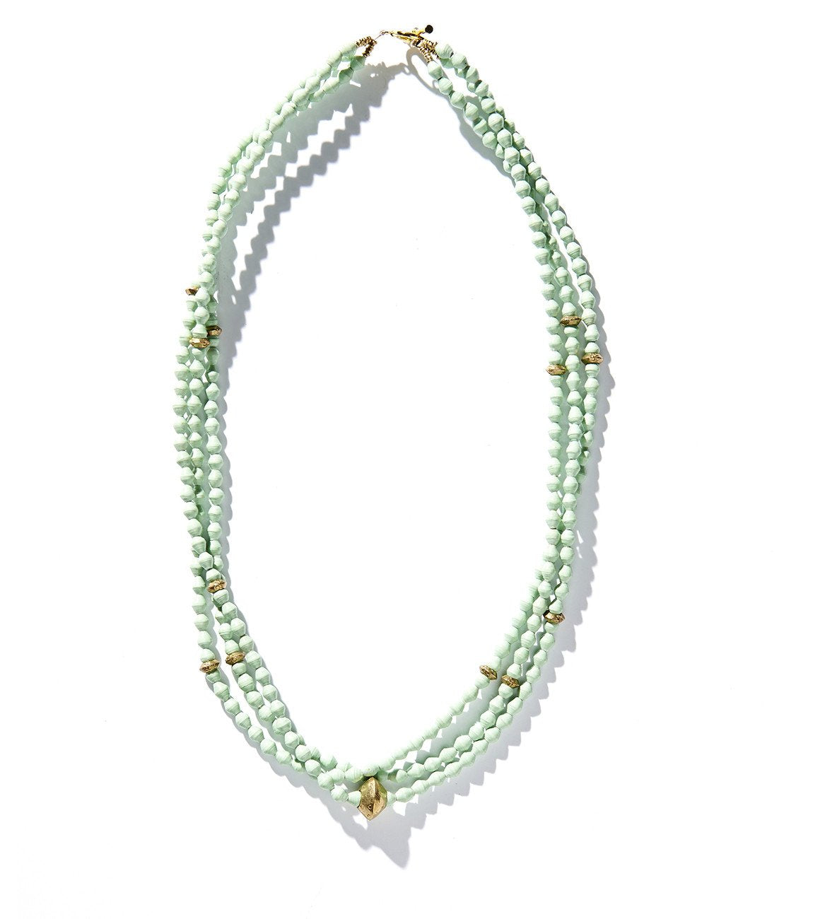Three strands of hand-rolled paper beads finished in a non-toxic varnish to give a stone like resemblance.