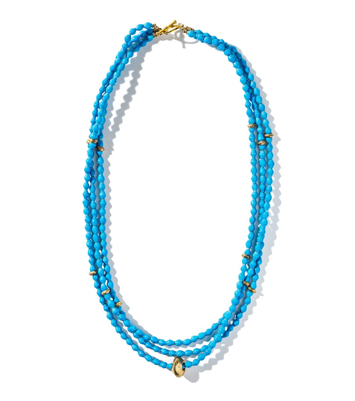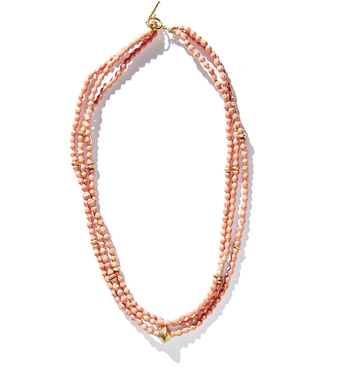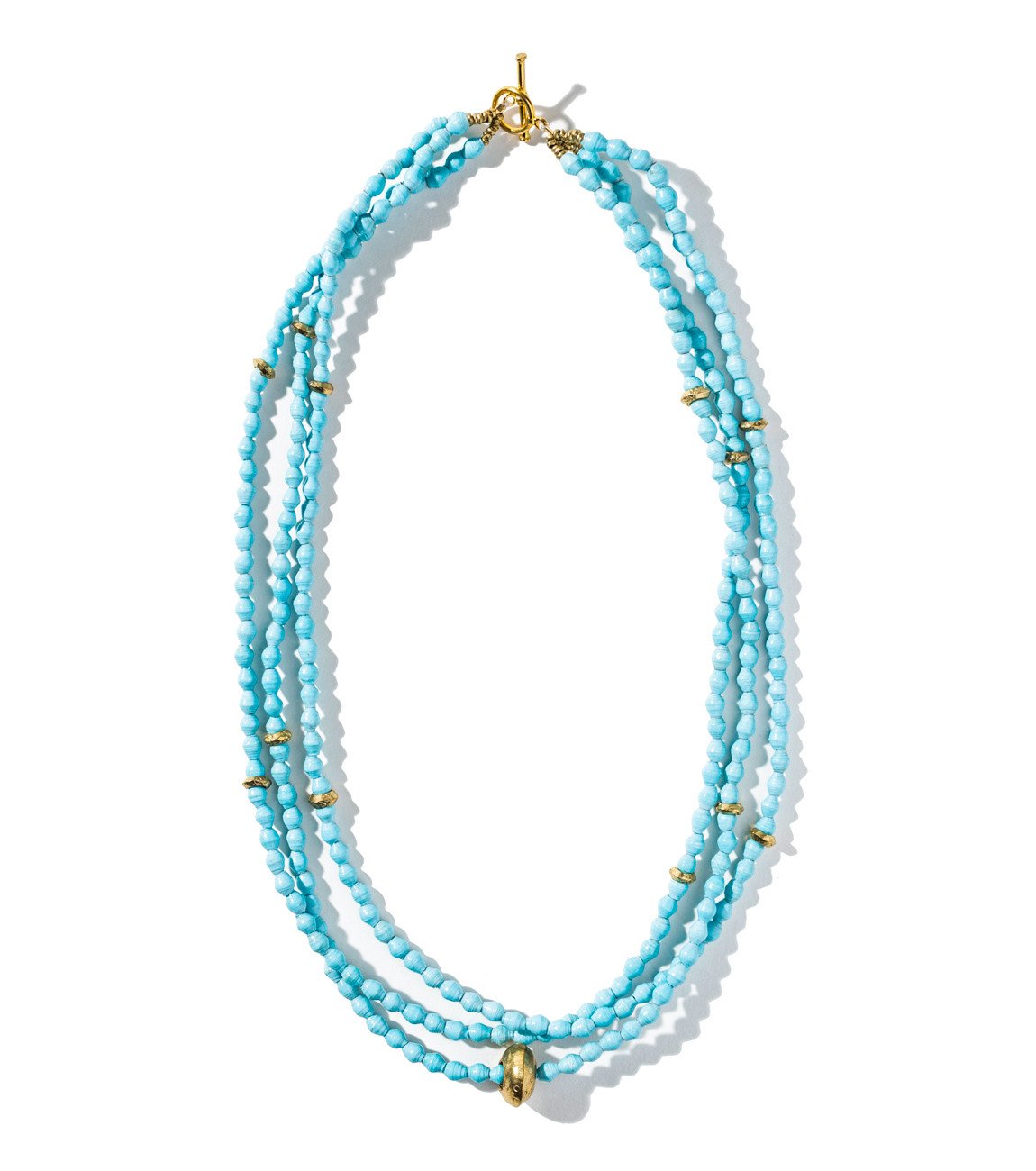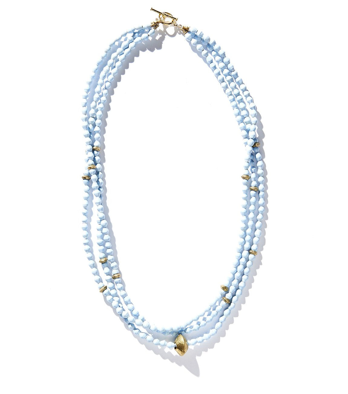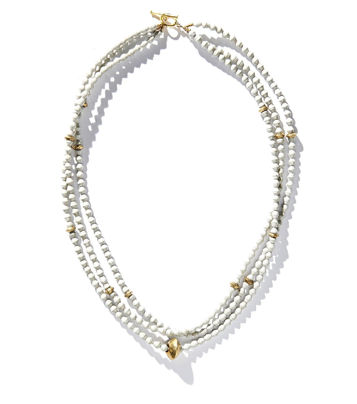 Three strands of hand-rolled paper beads finished in a non-toxic varnish to give a stone like resemblance.