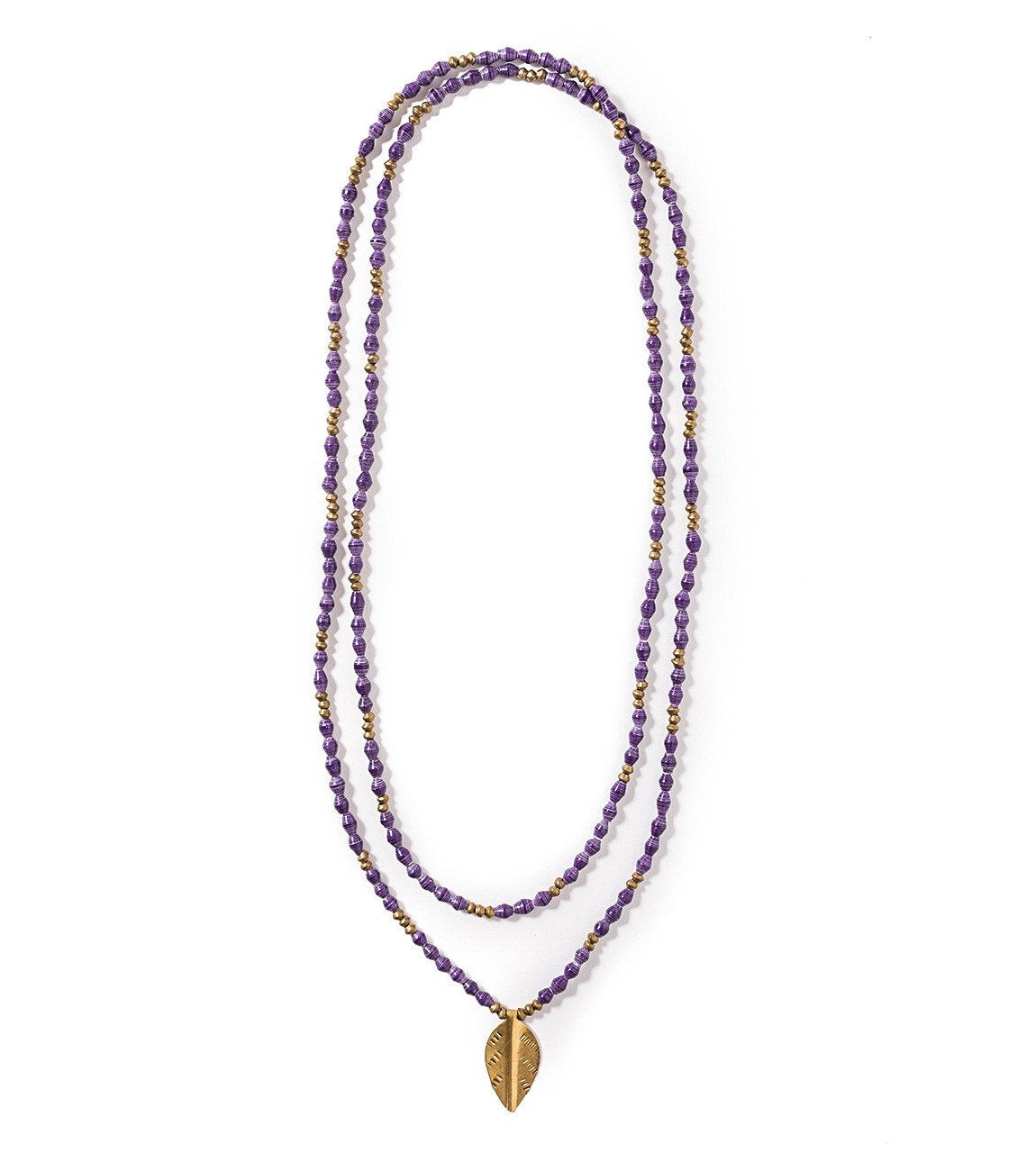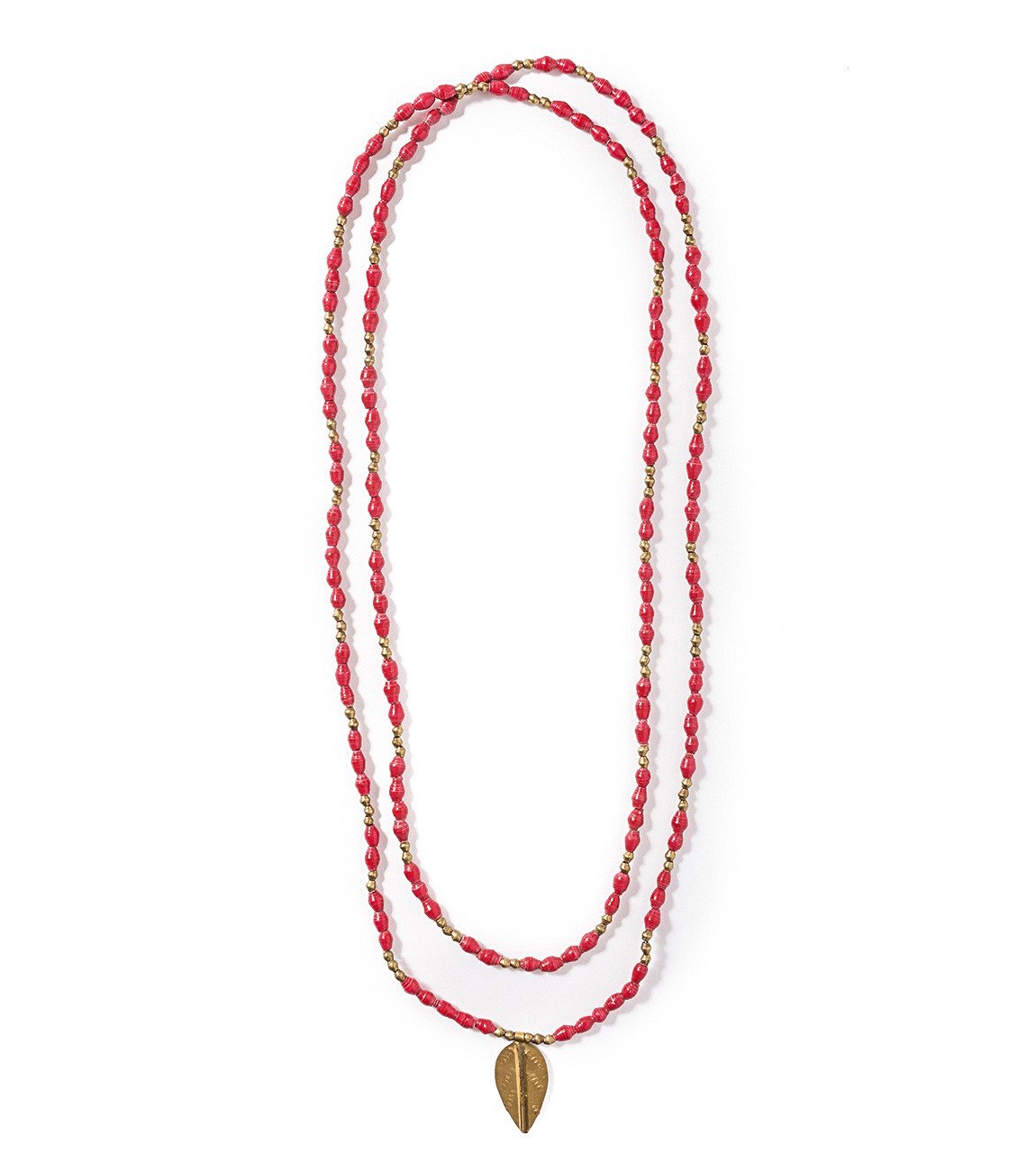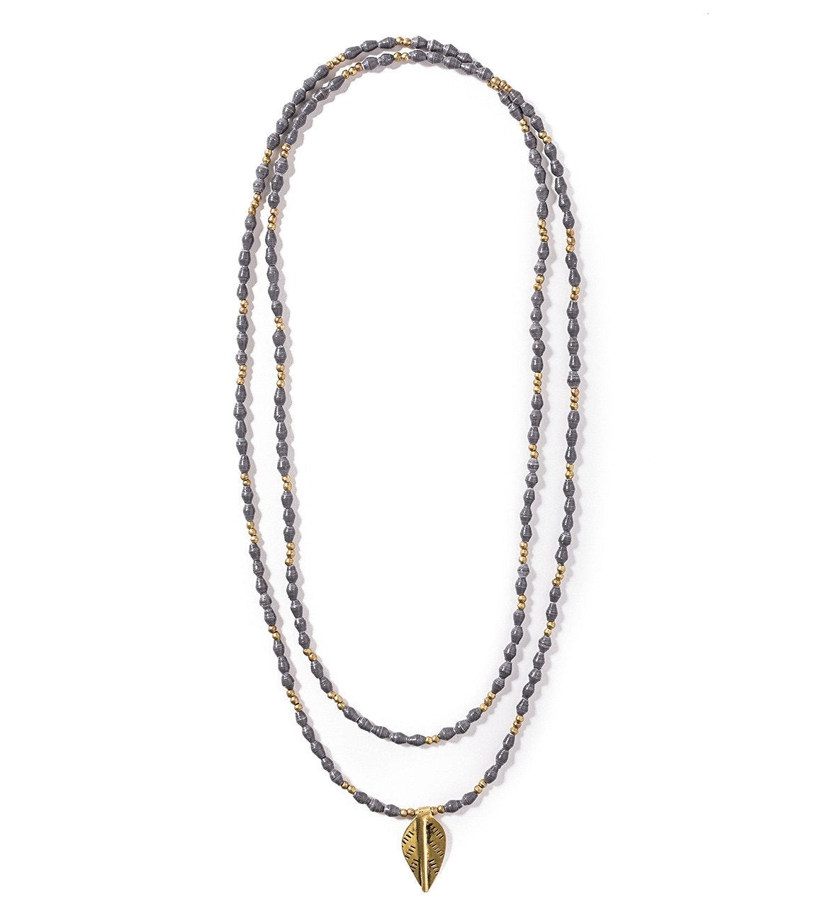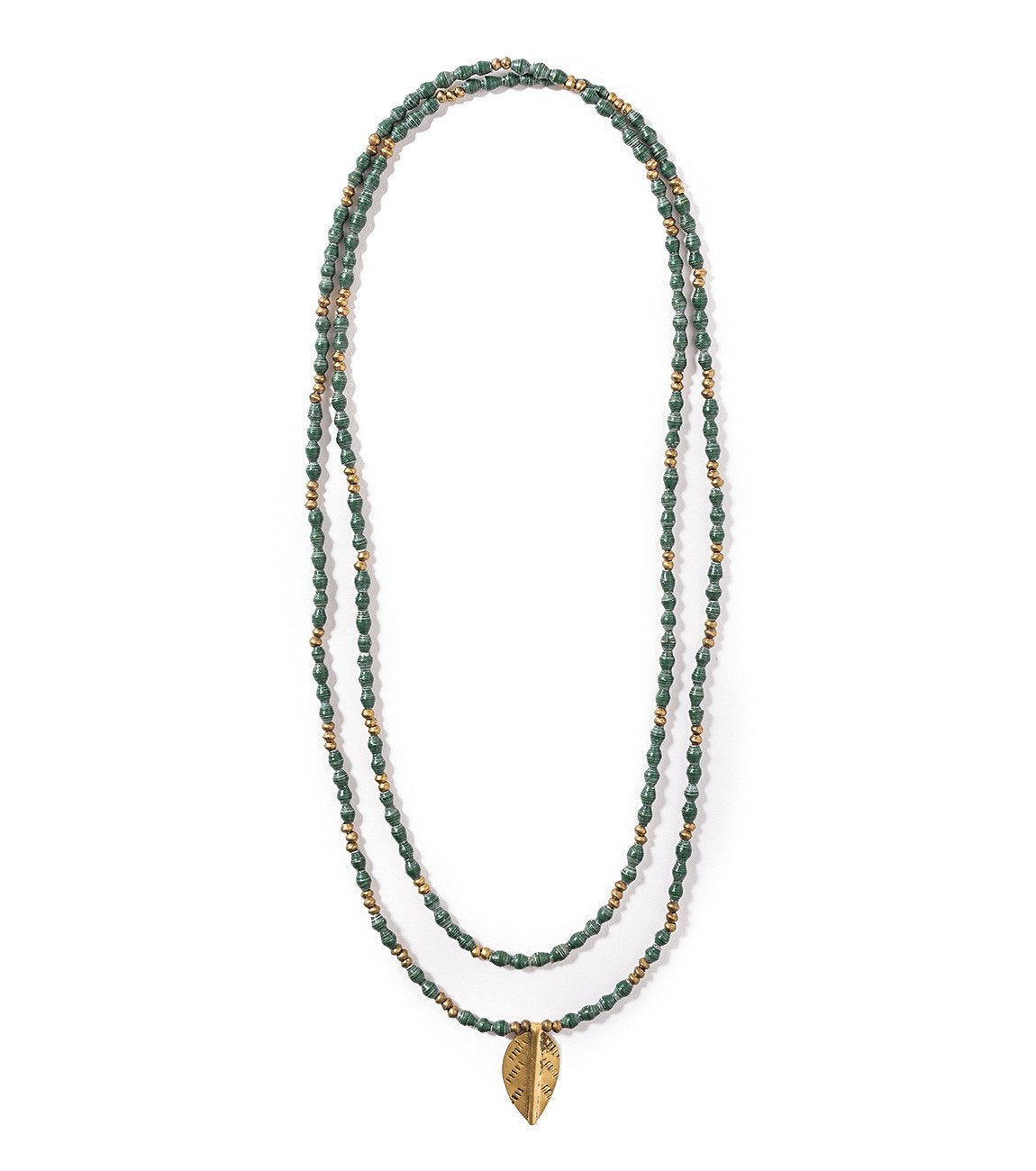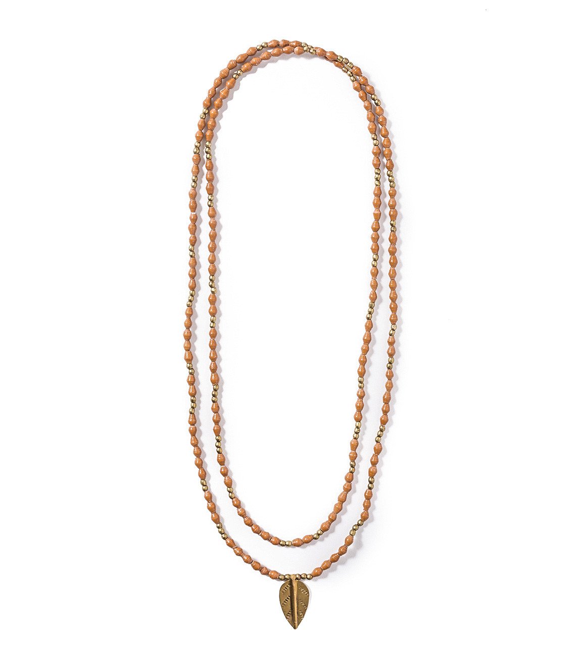 The Small Leaf Pendant is a hand-cast small metal leaf pendant plated with brass on two long strands of hand-rolled paper beads.