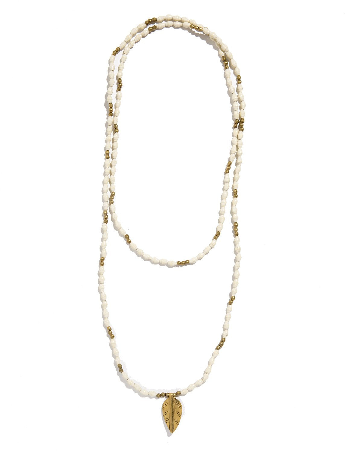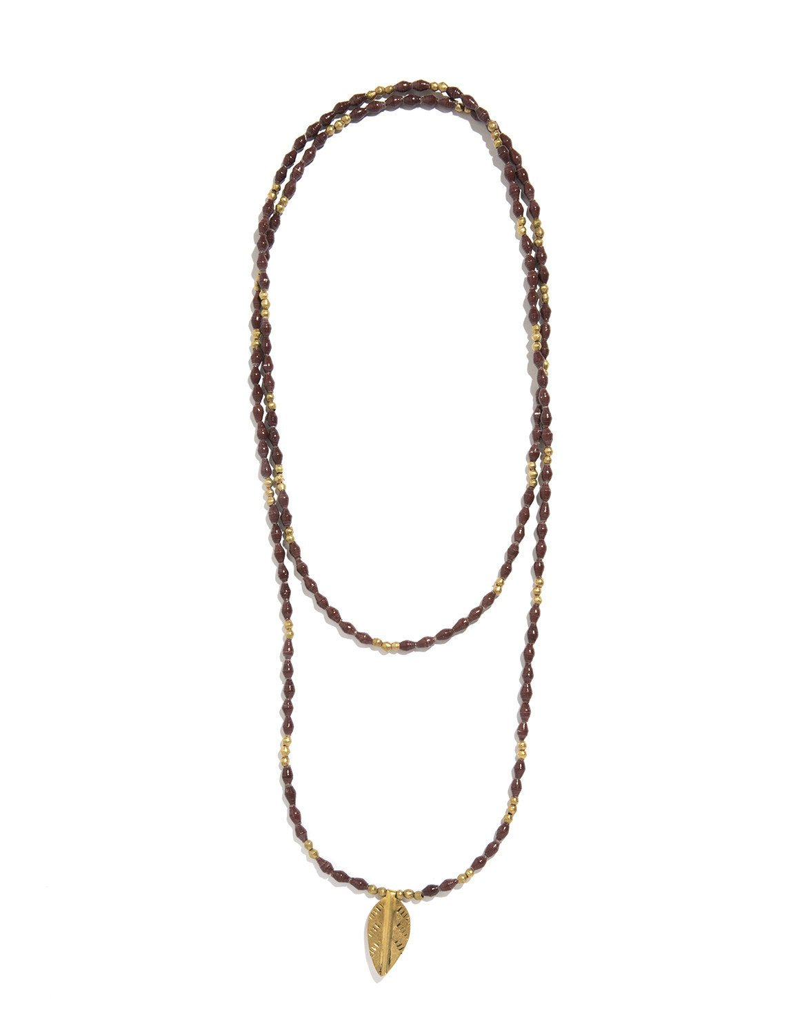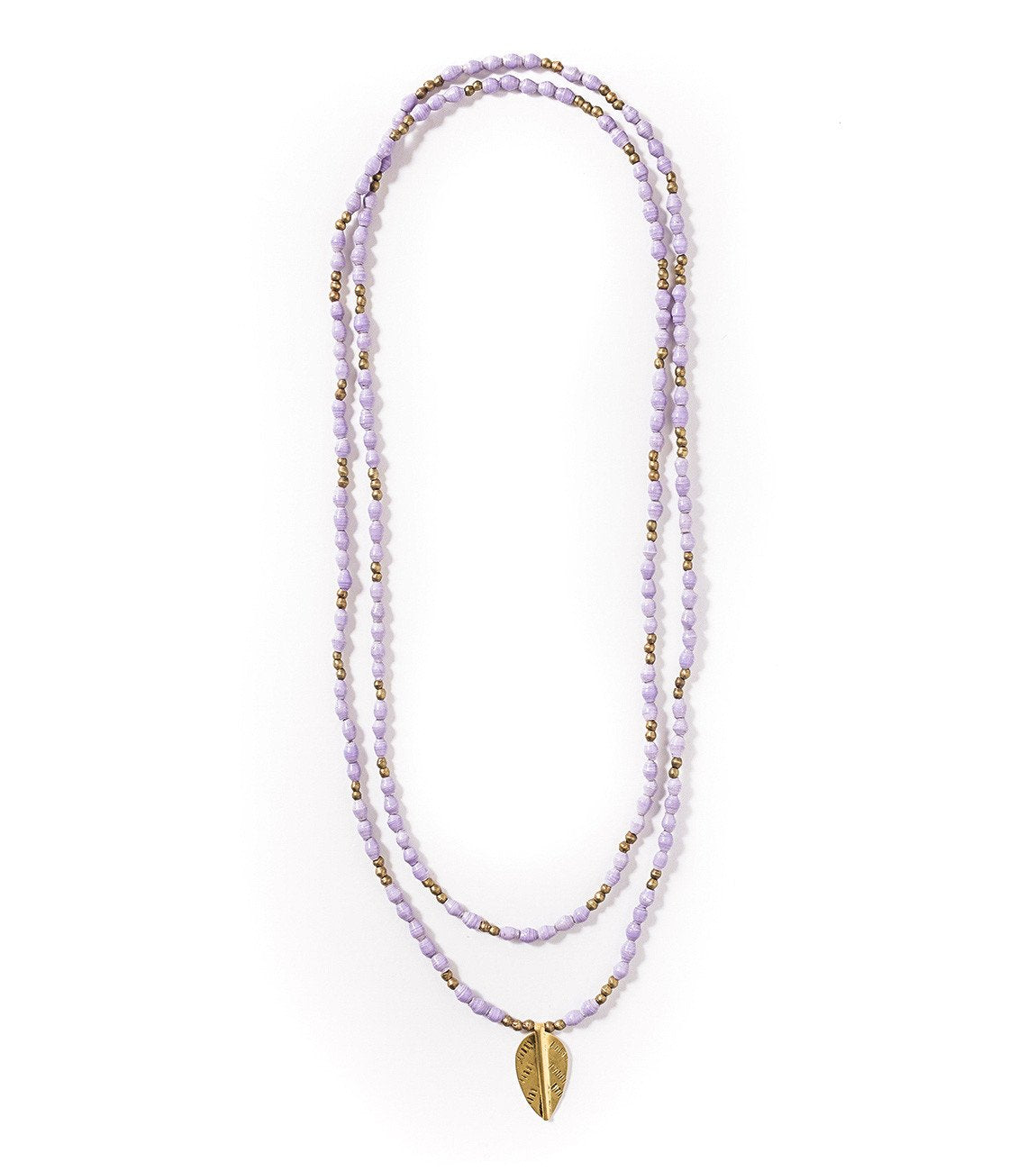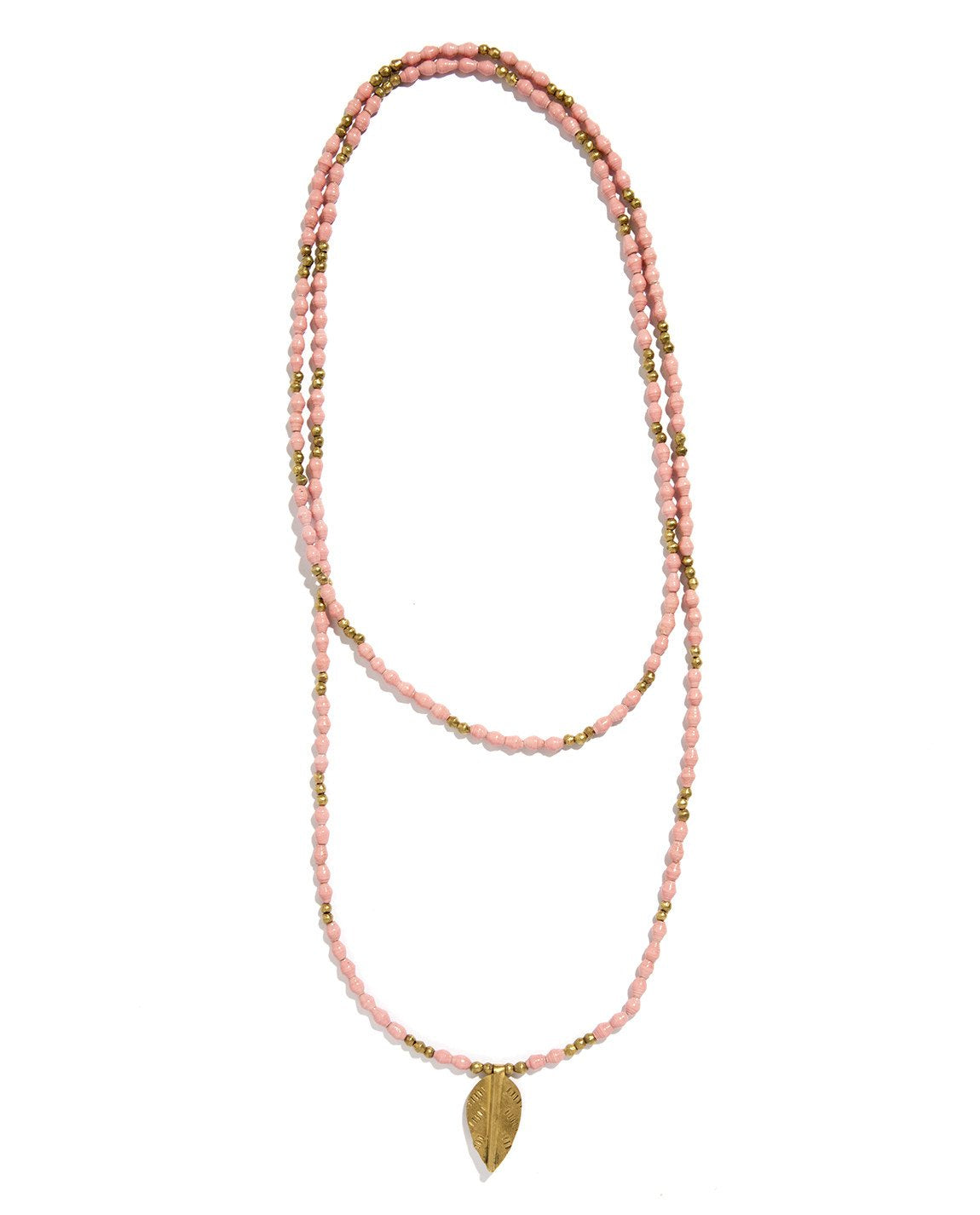 The Small Leaf Pendant is a hand-cast small metal leaf pendant plated with brass on two long strands of hand-rolled paper beads.