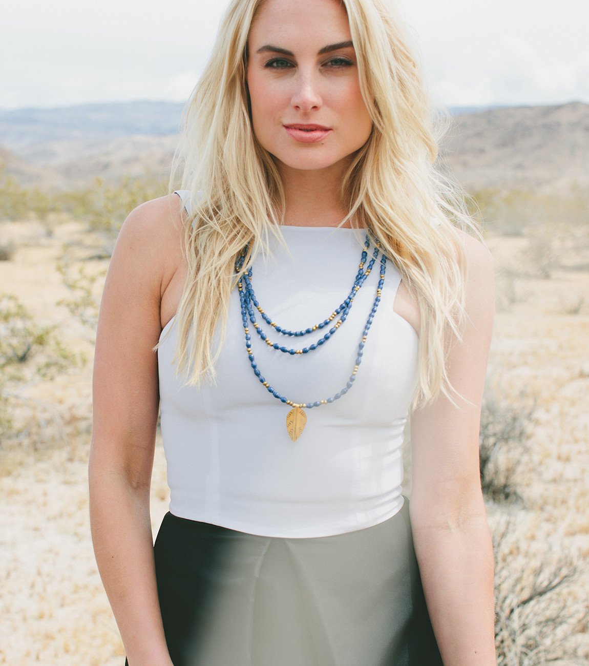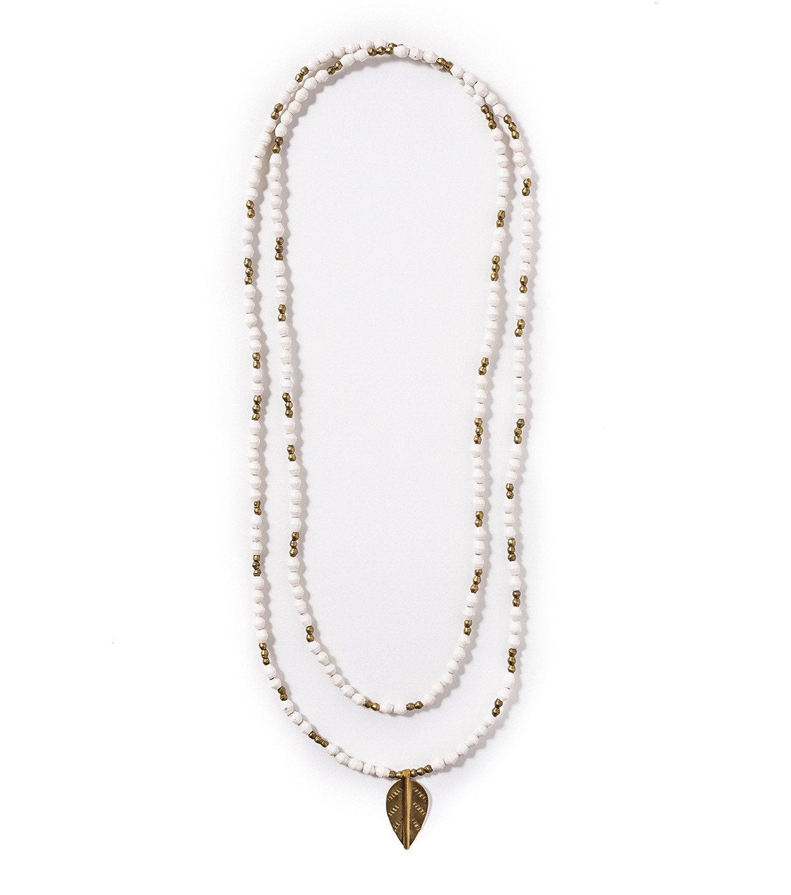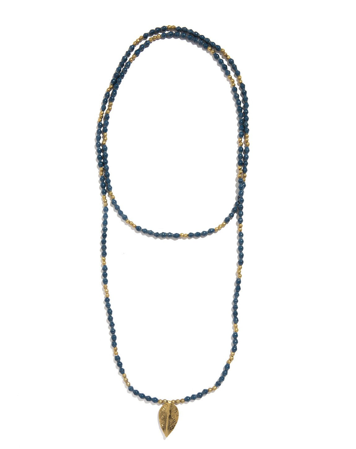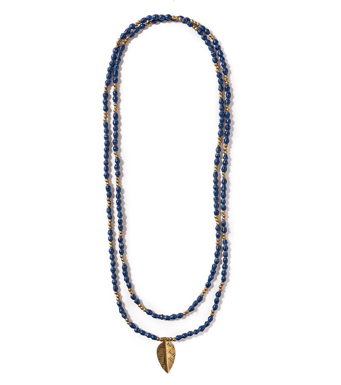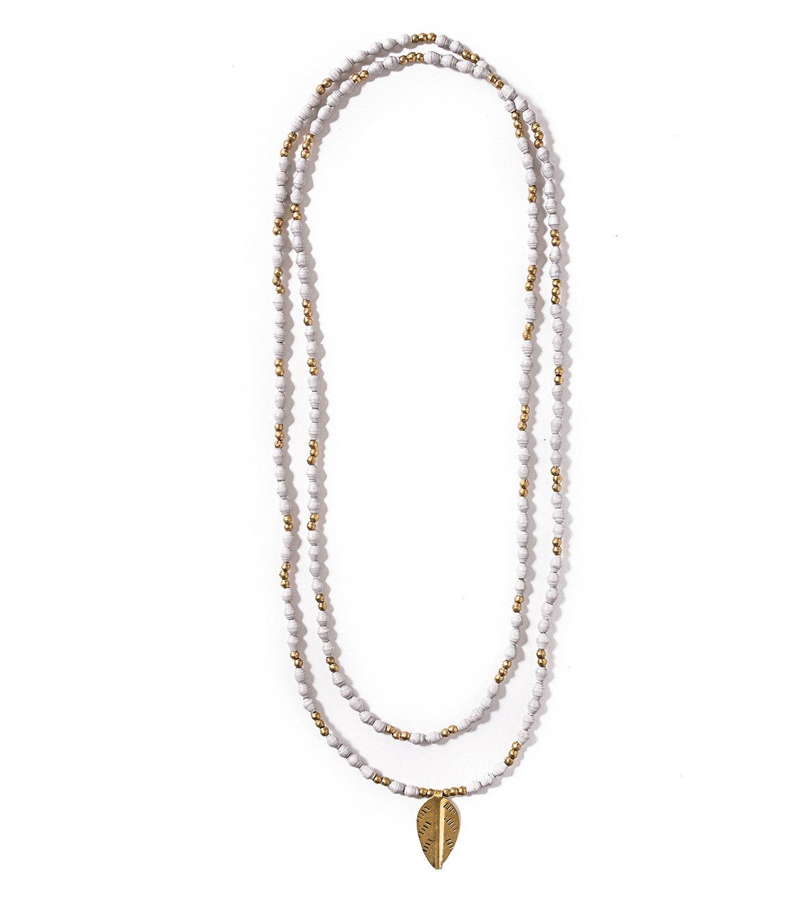 The Small Leaf Pendant is a hand-cast small metal leaf pendant plated with brass on two long strands of hand-rolled paper beads.