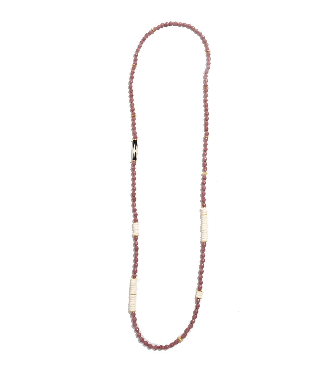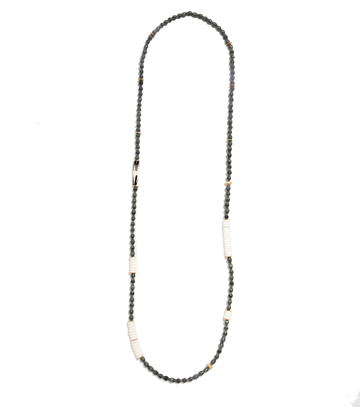 Single strand of hand-rolled paper beads finished in a non-toxic varnish to give a stone like resemblance sprinkled with Ethiopian hand-cast metal beads sprinkled with 18K plated gold discs and Kenyan bone beads.