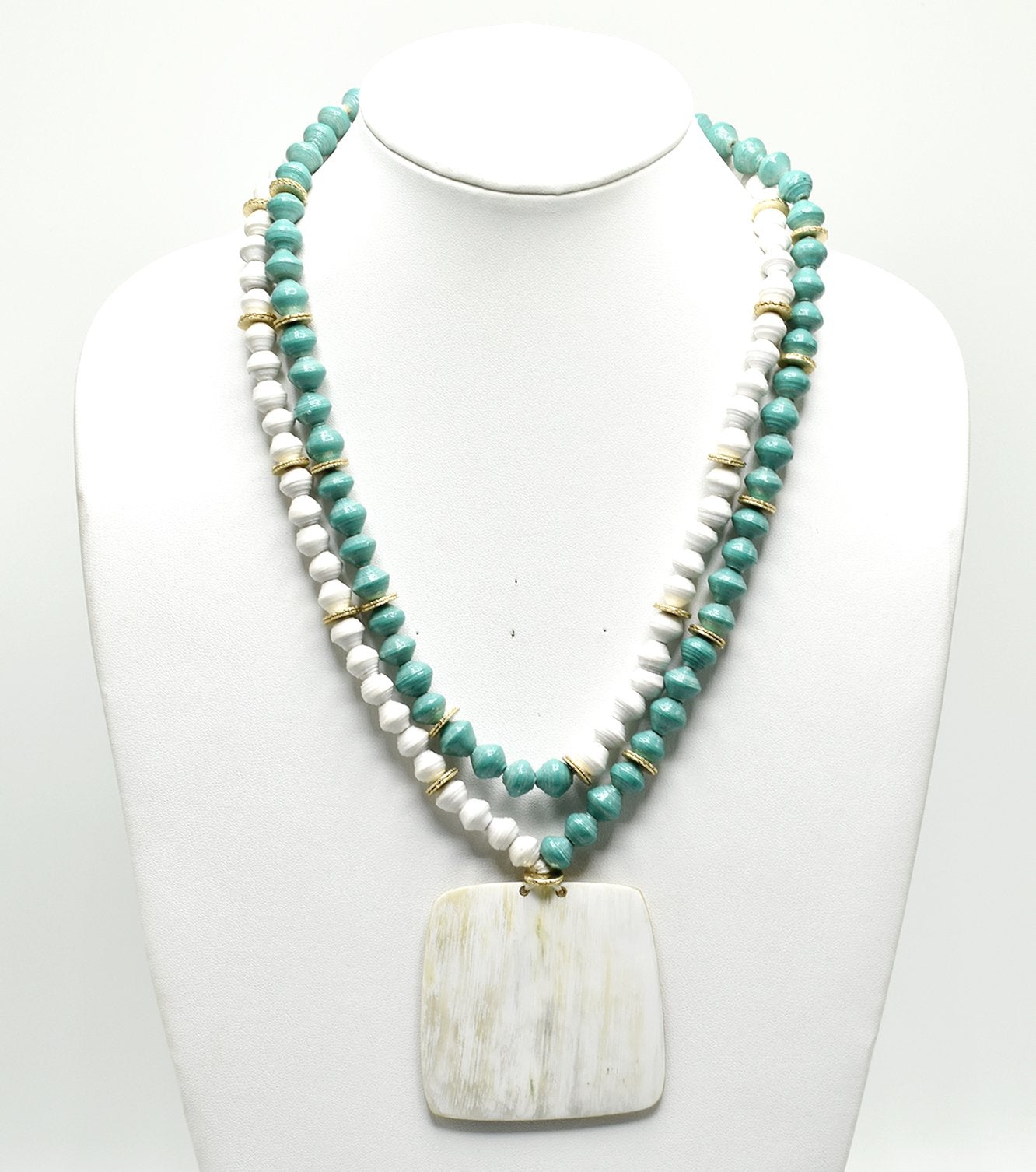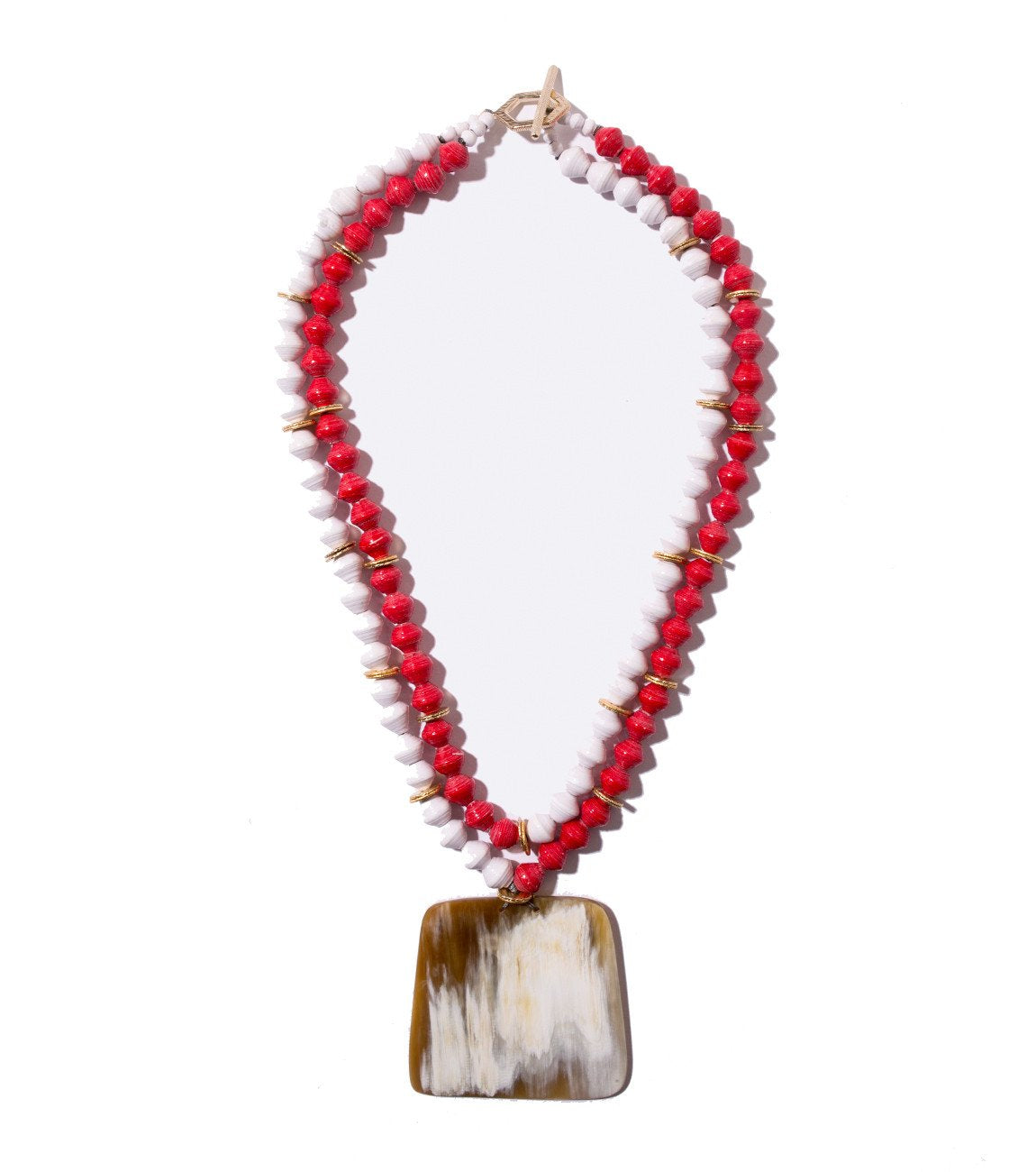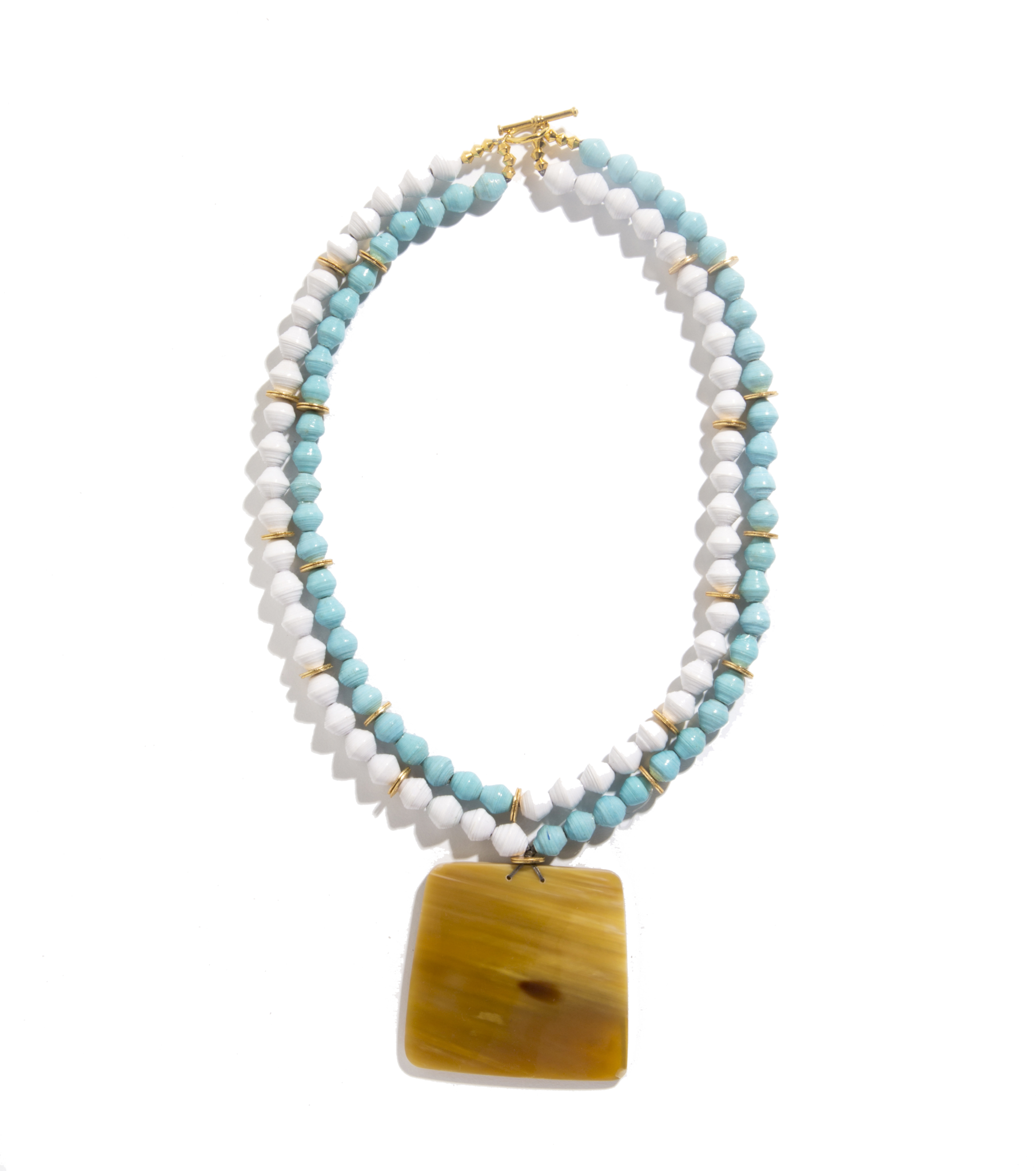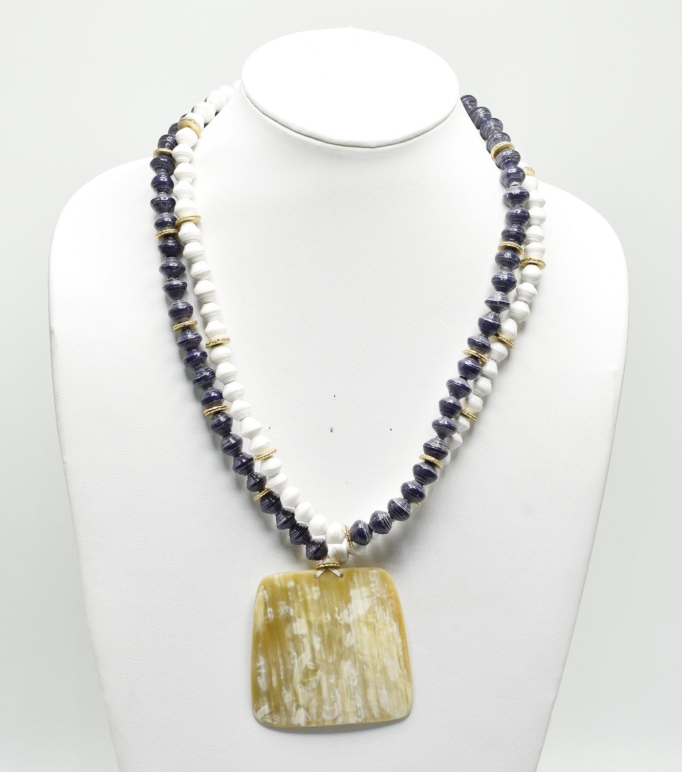 Two strands of hand-rolled Keratasi paper beads and gold plated metals accented with an ethically sourced horn pendant.
